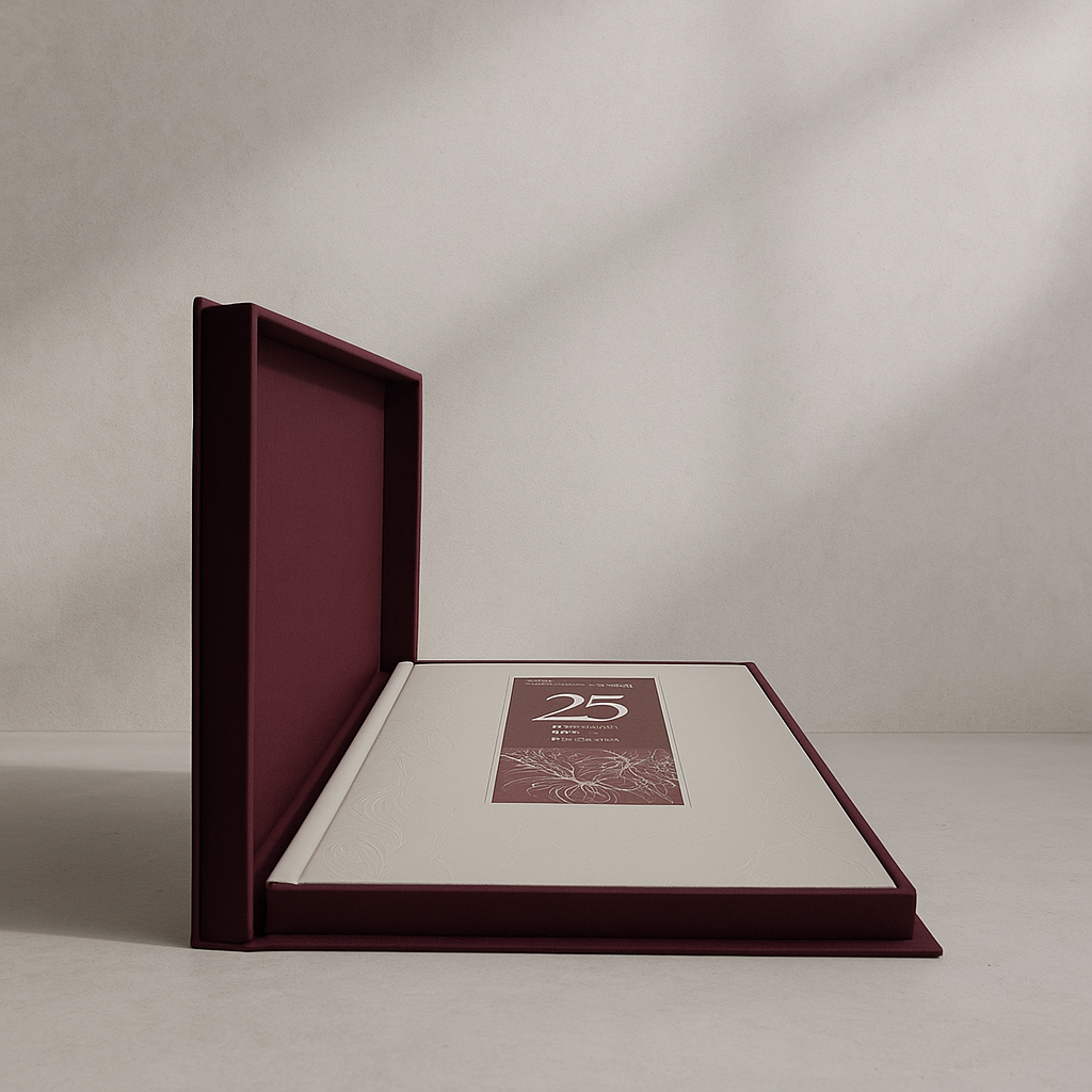 Book cover : 1/s stamped pattern, Slip case : silver matt foil
